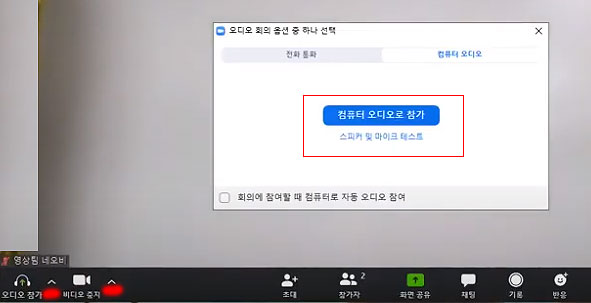 pc화면에서 마우스를 화면 하단에 오버시키면 음소거와 비디오에 관한 메뉴를 볼수 있습니다.